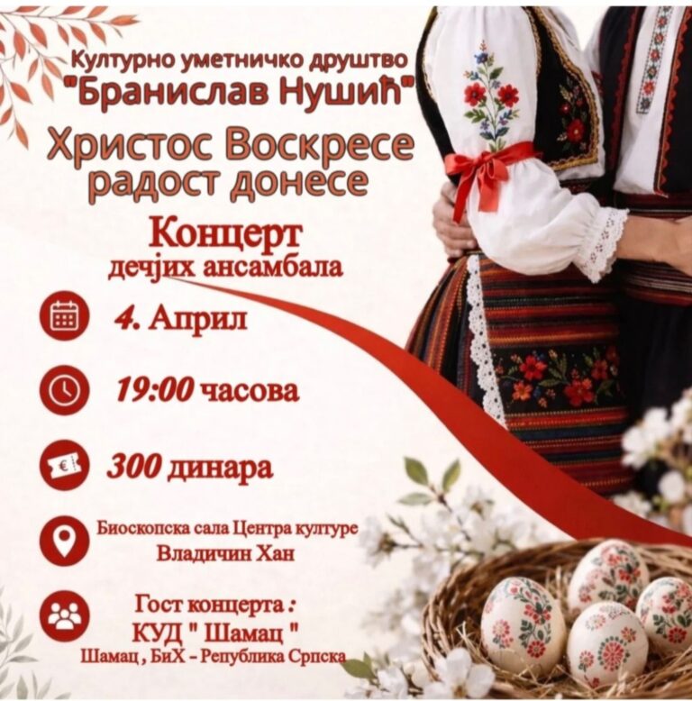 Културно-уметничко друштво „Бранислав Нушић“ из Владичиног Хана одржаће традиционални ускршњи концерт дечјих ансамбала у суботу,…