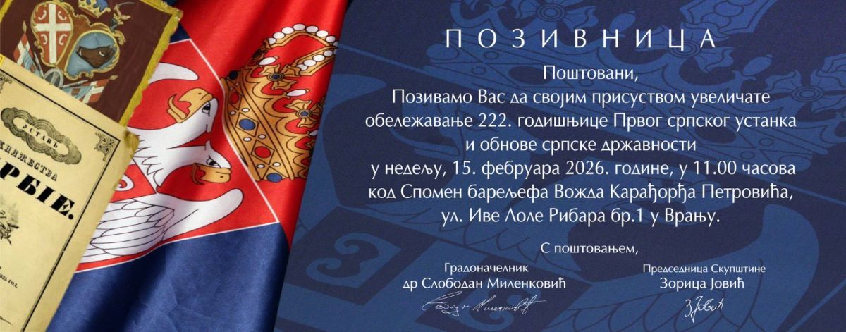 Поводом Дана државности недељу 15. фебруара у Врању ће државни празник бити обележен пригодним програмом на скупу код Спомен барељефа Вожду Карађорђу Петровићу. Присутнима ће се обратити председница Скупштине Зорица Јовић. Скуп почиње у 11 сати.