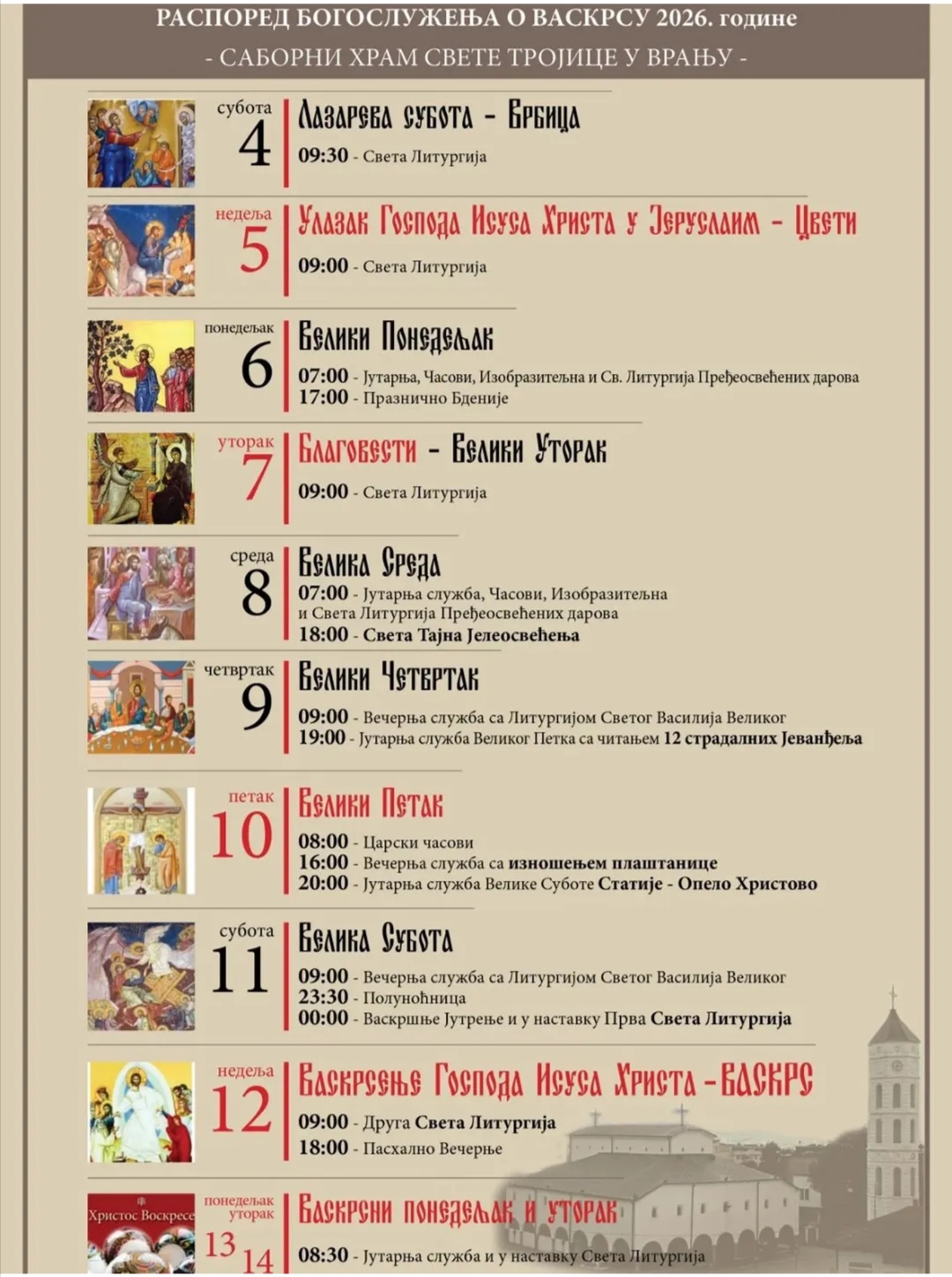 Епархија врањска објавила је распоред богослужења у Саборном храму Свете Тројице у току Страсне седмице и за предстојећи Васкрс. Распоред је следећи: