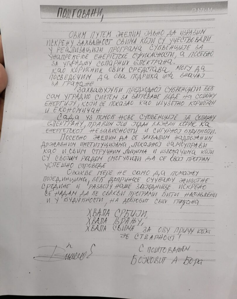 Овим путем желим јавно да изразим искрену захвалност свима који су учествовали у реализацији програма субвенција за унапређење енергетске ефикасности, а посебно за уградњу соларних електрана.