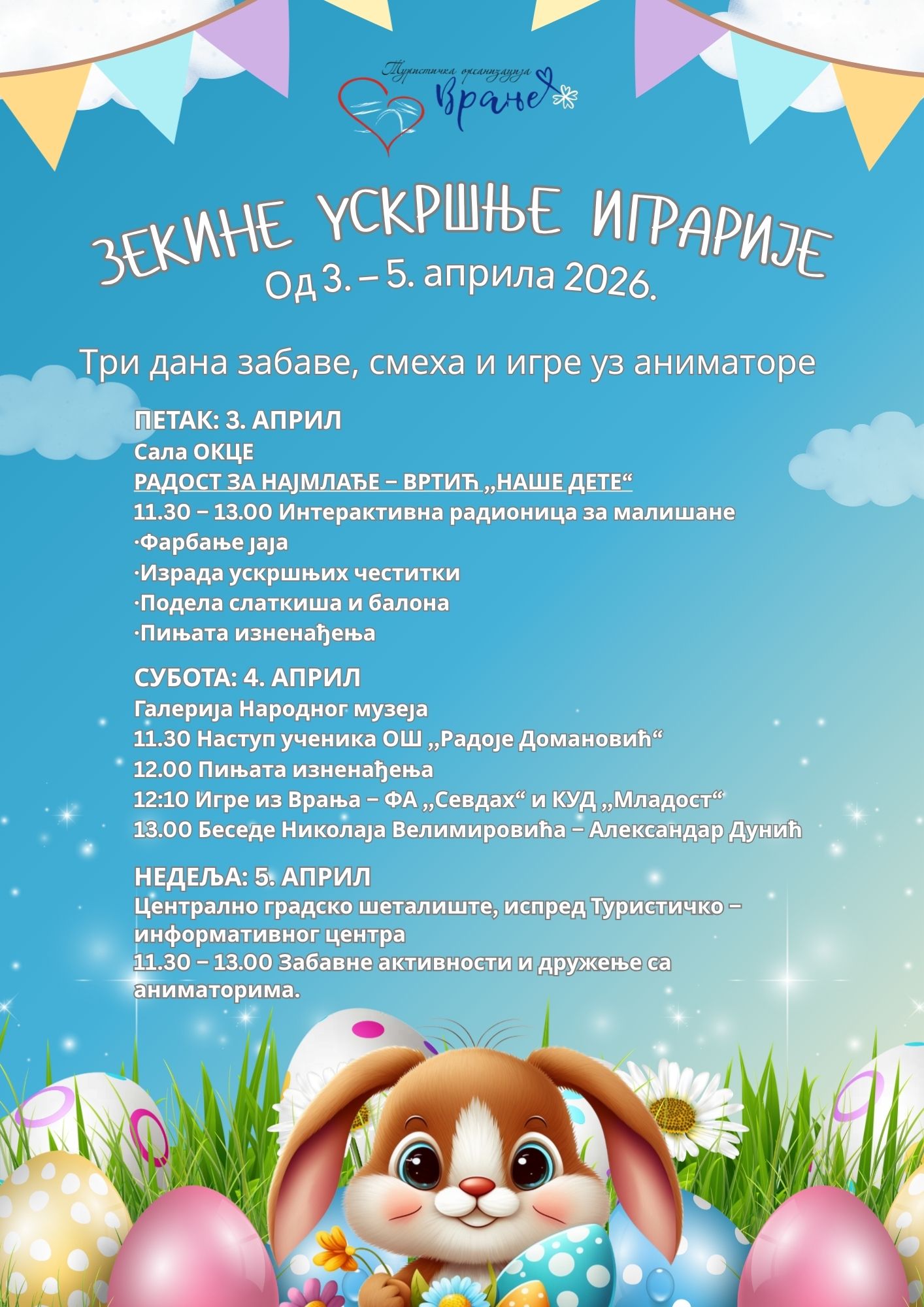 Туристичка организација града Врања и ове године припремила је „Зекине ускршње играрије“ манифестацију за најмлађе, у сусрет великом празнику Васкрсу. Почев од данас малишани ће уживати у различитим активностима намењеним њима, у духу празника који долази. „Зекине ускршње играрије“ одржавају се од 3. до 5. априла на више локација: у сали ОКЦЕ, Галерији Народног музеја и на Градском шеталишту.